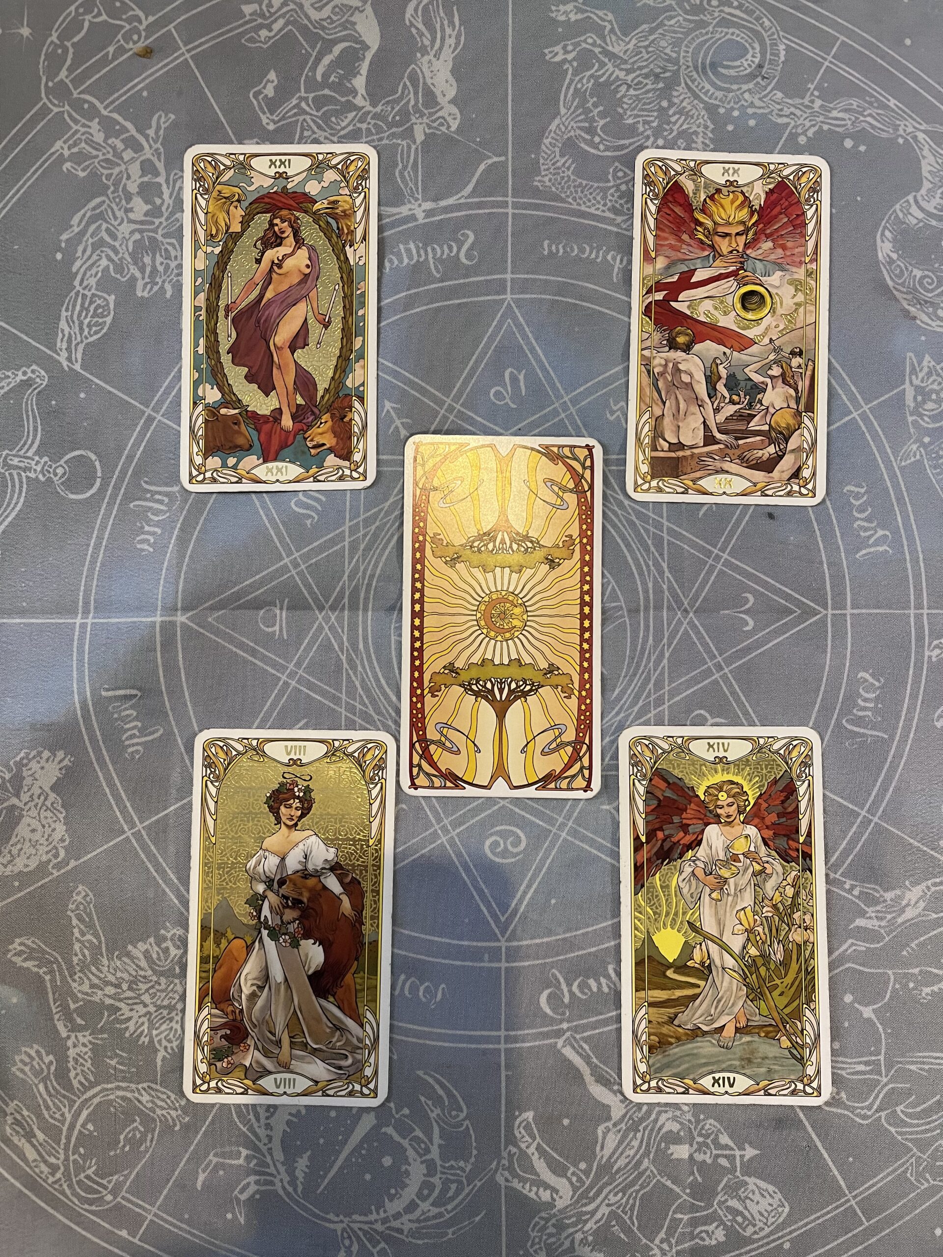 Σε αυτή τη διάταξη, η Δύναμη αντιπροσωπεύει την ικανότητα να ξεπερνά κανείς τα προβλήματα με τη χρήση της δύναμης της θέλησης. Η εγκράτεια μπορεί επίσης να αντιπροσωπεύει τη δύναμη της θέλησης στην αποφυγή πραγμάτων και στη ζωή σε αρμονική ισορροπία. Η κρίση αντιπροσωπεύει την απελευθέρωση από τη συνήθεια και την επίτευξη μιας σημαντικής αυτοβελτίωσης/μεταμόρφωσης. Ο Κόσμος αντιπροσωπεύει την ολότητα, την ικανοποίηση, την υγεία, την τελειότητα και την ευτυχία. Εάν θέλετε να χρησιμοποιήσετε αξεσουάρ για αυτό το ξόρκι, χρησιμοποιήστε λευκά κεριά, λουλούδια, κρυστάλλους, πολύτιμους λίθους και ύφασμα, εάν θέλετε να τονίσετε τον “καθαρισμό” και την “κάθαρση” που πρέπει να επιτευχθεί. Ωστόσο, εάν προτιμάτε να τονίσετε τις θεραπευτικές πτυχές αυτού του ξορκιού, χρησιμοποιήστε το πράσινο χρώμα.